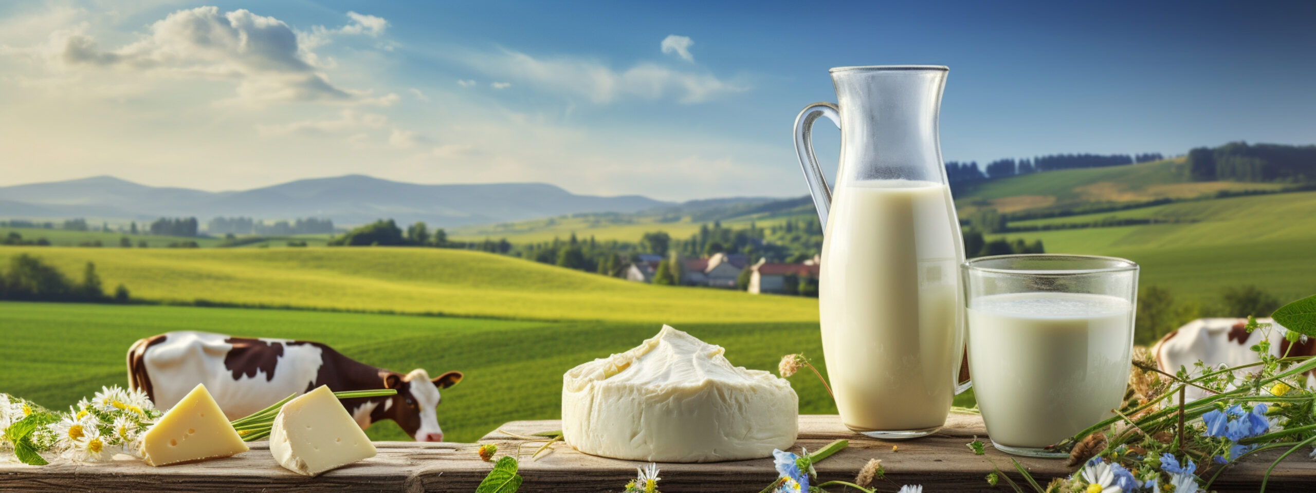 Milk and dairy products against the backdrop of a meadow with grazing cows. Generative AI,
